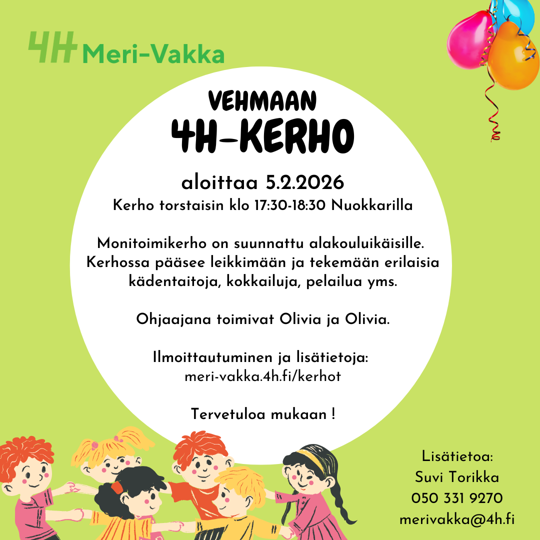 Vehmaalla aloittaa helmikuussa 4H-kerho, kun Meri-Vakan 4H-yhdistys järjestää muutaman vuoden tauon jälkeen taas lapsille kerhotoimintaa. Kerho on niin sanottu monitoimikerho ja se on suunnattu…