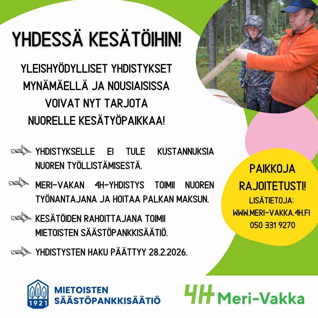 Mietoisten Säästöpankkisäätiön rahoittama Yhdessä kesätöihin!- hanke jatkuu vuonna 2026 Mynämäellä ja Nousiaisissa.